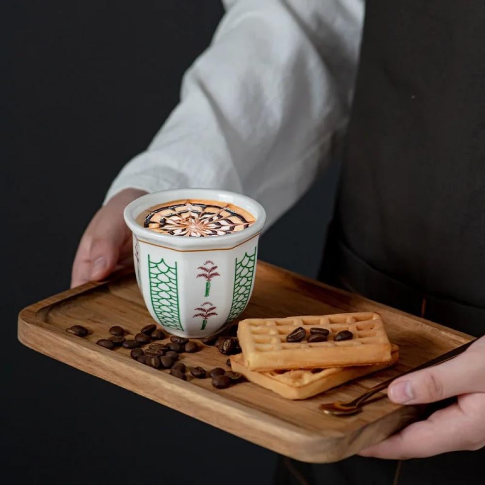 القدح الحليب الجليد هو فنجان قهوة عربي مصنوع من السيراميك عالي الجودة، بنمط بدوي تقليدي ونقوش نخيل مميزة، يجمع بين روح الضيافة العربية والأناقة العصرية بلون أحمر وتركواز جذاب.